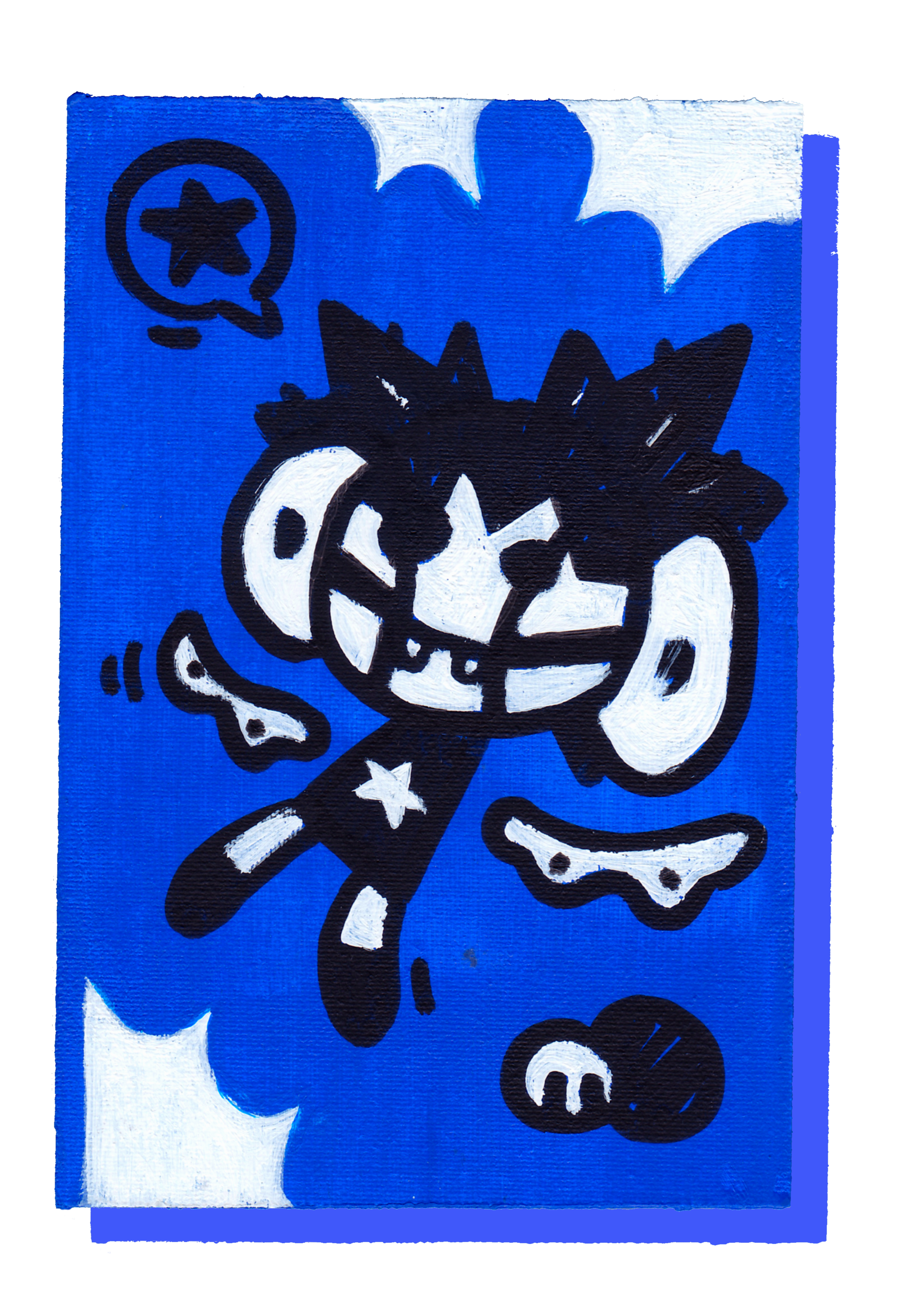 From there Disaster Donkies evolved quickly, both in its ideas and forms, and is still doing so. What started as a simple black on white ballpoint pen drawing, quickly derived to self published zine, animations, stickers and merch, acrylic paintings, and now 3D. And is to hopefully further expand as time goes.