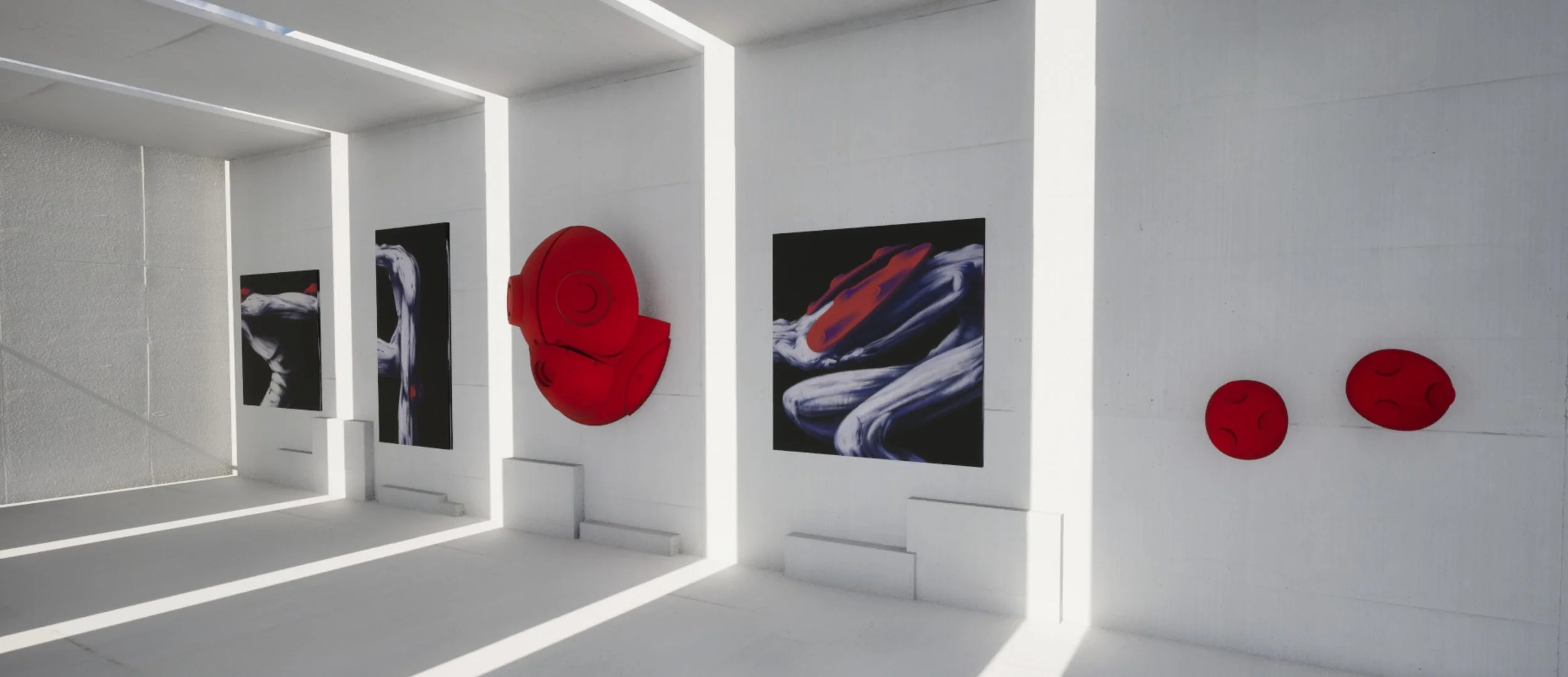 The work mixes alternative narration forms with philosophical speech. This project tells and depicts a fictional science fiction world in a non linear fashion across different mediums, primarily paintings and sculpture. Through portraiture, paintings of the body and characters, sculptures of fictional technologies, clothing apparels or even rendition of the fictional environment and its architecture, the work documents step by step a setting, its technology, culture and people. Those elements end up being showcased through means similar to what one would find in a museum.